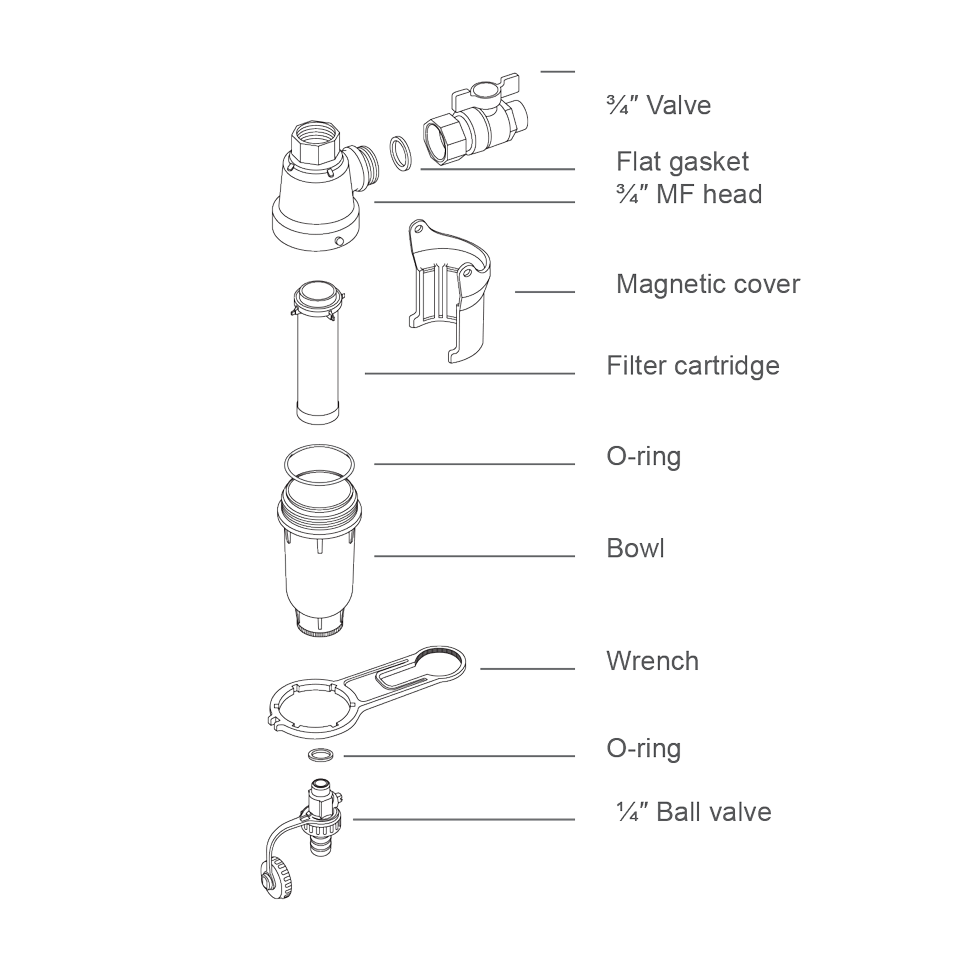 • Package Includes: Filter, cartridge, service wrench, two ball valves